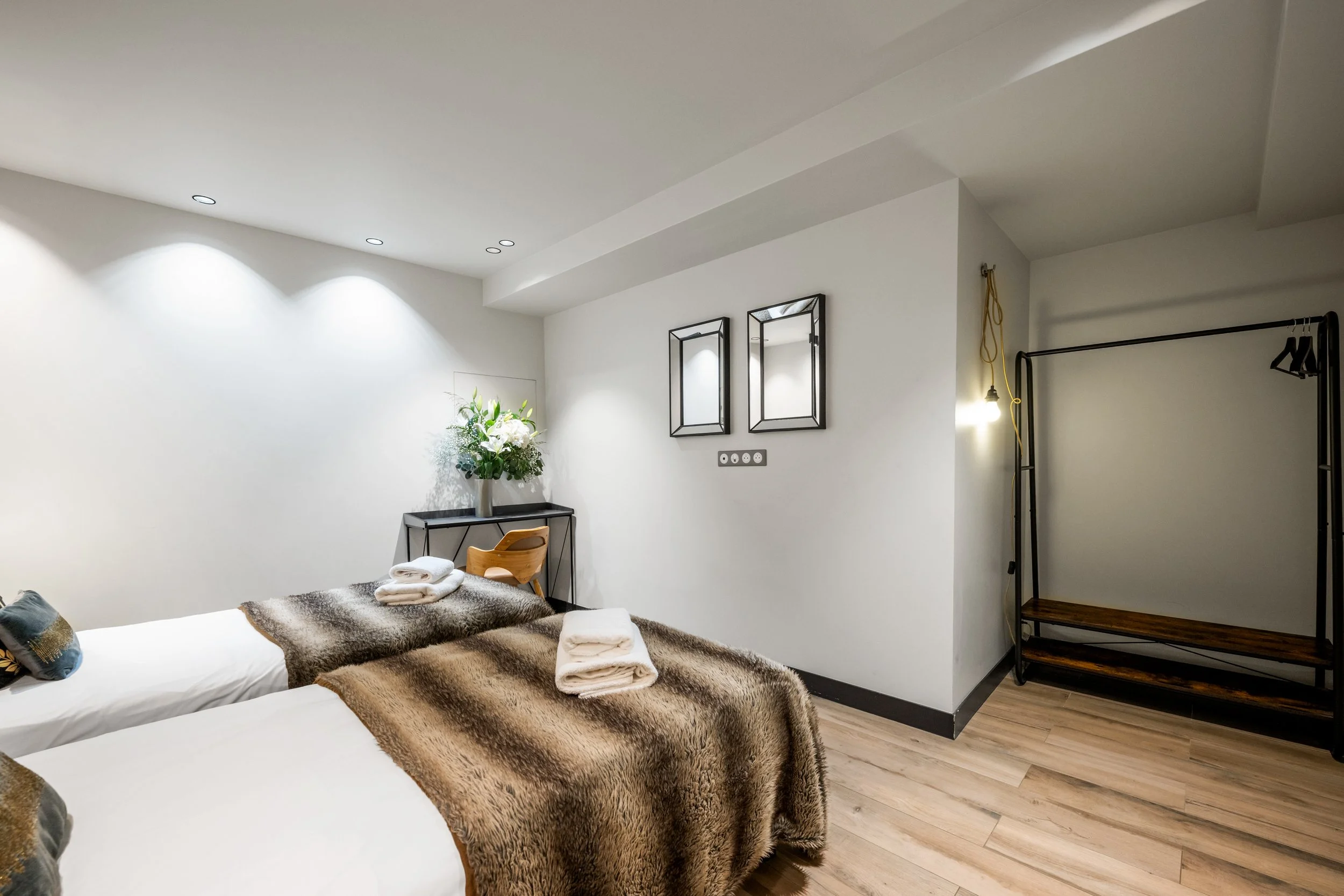 Rock African Chic: it is the style our architect Jessica wanted to transcribe in this former archive room. In addition to her passion for her job, she shares with us through this apartment another passion, the one for the sulphurous artist Lenny Kravitz. This original accommodation with its lower level brings warmth and comfort thanks to its brown leather furniture, its imitation animal skin tapestries and warm lighting. The wild atmosphere is also highlighted by its bestial decoration, not forgetting the few portraits of the artist with his charm and bewitching aura.